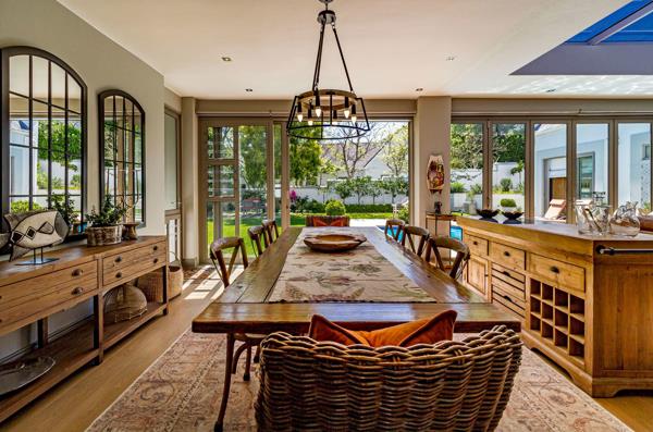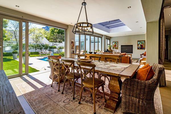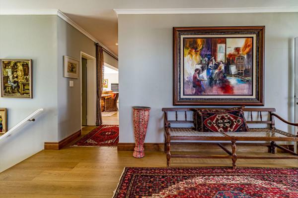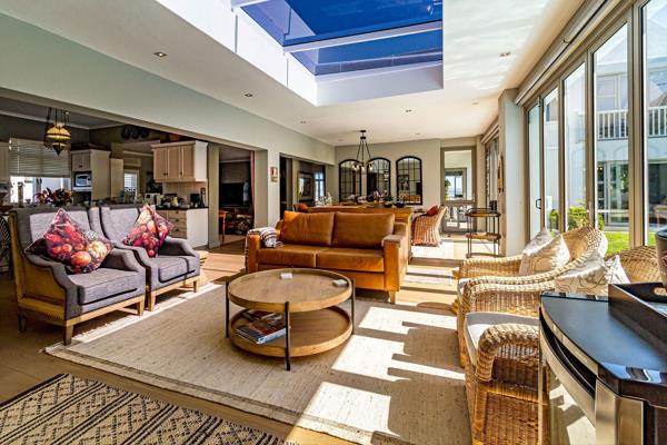 The homes welcoming portico entrance leads into a double lounge layout with high ceilings, arched aluminium windows, and interlinked seating areas leading to a spacious study. The study opens to the garden and includes a staircase to a versatile loft, currently used as a gym, with inspiring mountain views.