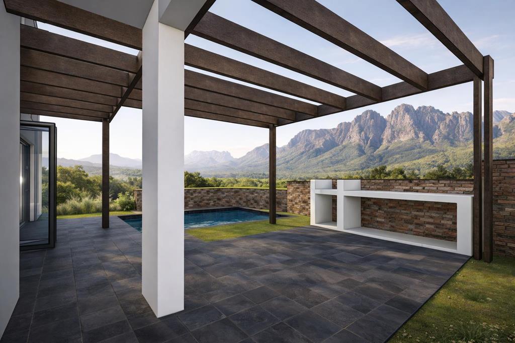 Downstairs, a dedicated entertainment area with its own kitchenette opens seamlessly to the pool deckframed by uninterrupted views of Simonsberg and the majestic Banhoek Valley mountains. With two indoor braai areas, an additional outdoor braai, and a double garage, every element has been carefully considered to enhance effortless Winelands living.