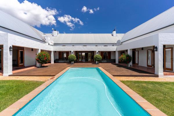 The Cape Dutch styled homestead positioned on the South-Eastern corner of the farm with breathtaking mountain views, features characteristic whitewashed walls, gabled roof lines, and large, inviting front porch.