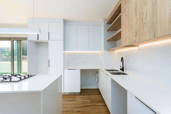 The kitchen has been stylishly upgraded to include under-mount sinks, ambient LED lighting beneath the upper cabinets and shelving, as well as elegant pendant lights that add a contemporary touch.