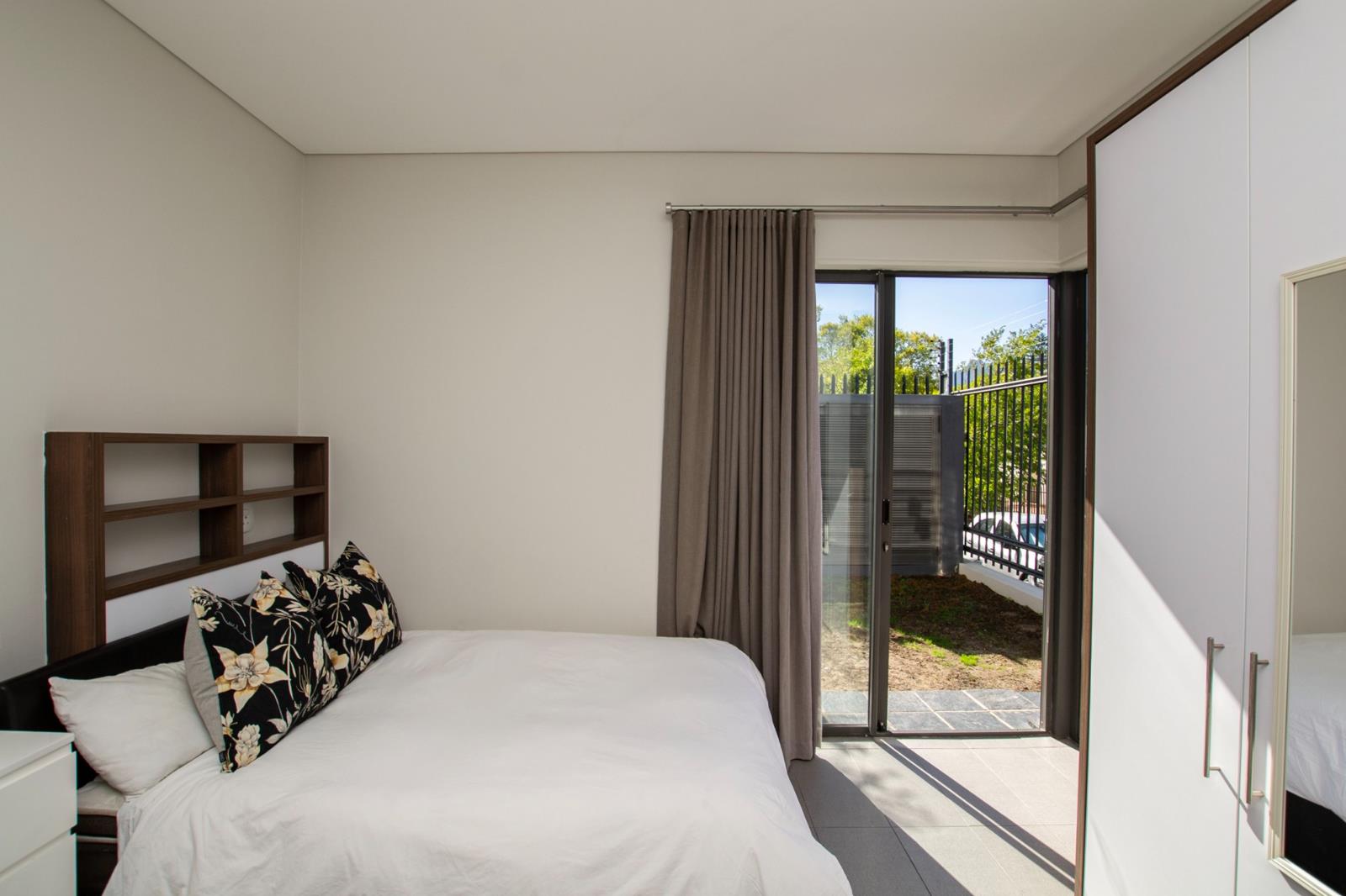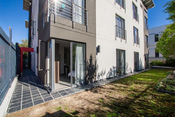 The unit is fully furnished and features a sliding door that opens onto a private green space, as well as a secure internal door within the building. Built-in features include quality cupboards and a functional study desk. The apartment comes furnished with a bed (base & mattress), headboard, shelving, fridge, flat-screen TV, hob, and oven-microwave combo. Elegant curtains and a modern bathroom complete this move-in-ready space.