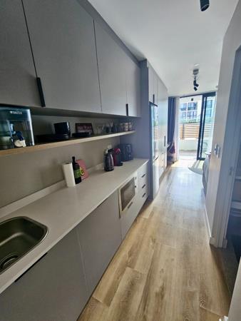 Step inside this thoughtfully designed apartment, where modern aesthetics meet functional living. The open-plan layout seamlessly integrates a sleek kitchen, boasting dark grey cabinetry and integrated appliances including an oven and fridge.