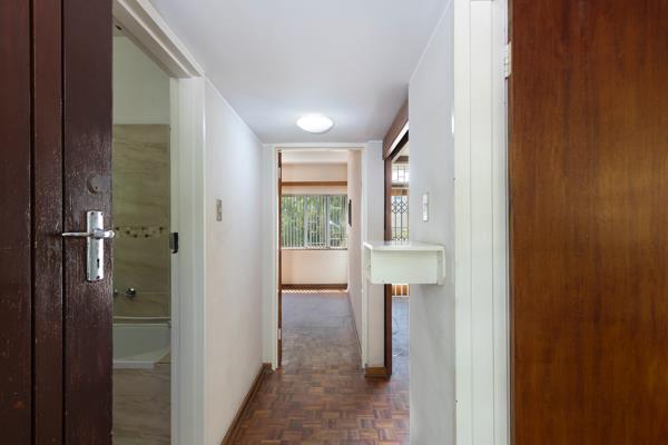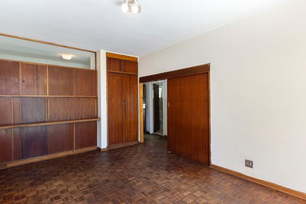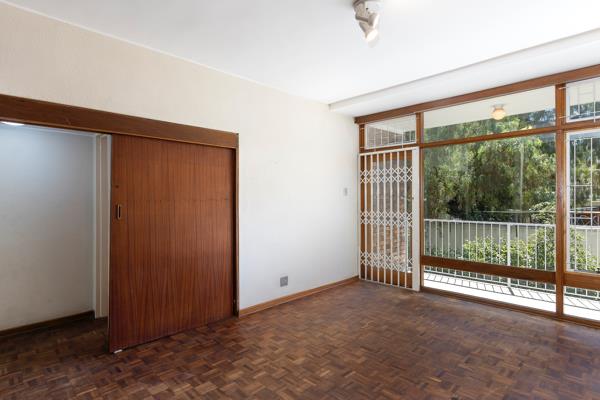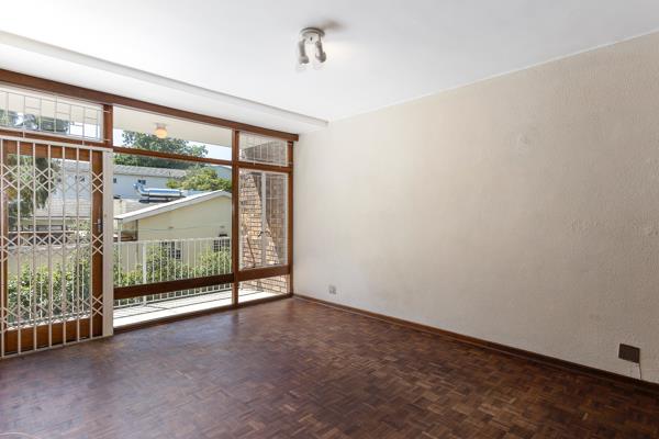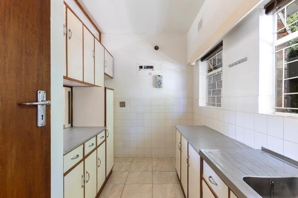 The apartment features classic parquet flooring throughout the spacious lounge and dining area, complemented by large windows that allow for excellent natural light. The kitchen offers ample cupboard space with potential for modern upgrades.