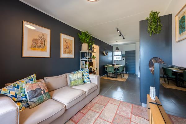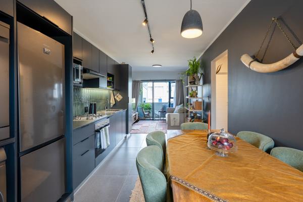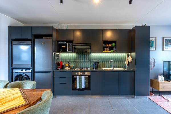 Upon entering, you are welcomed into a dining area that flows seamlessly into the open-plan kitchen. The kitchen is neatly finished with a show-stopping green tiled backsplash, featuring a 4-plate gas stove, oven, extractor fan, microwave shelf, single sink with a modern countertop, ample cupboard space, a magnetic knife block, and plumbing points for a washing machine and dishwasher. The kitchen features ample plug points, including built-in USB-A & USB-C charging points at the countertop level.