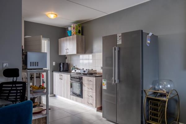 The lounge area is bright and welcoming, featuring tiled flooring and large windows that allow plenty of natural sunlight to fill the space, creating a warm and inviting atmosphere for everyday living and entertaining. The kitchen is well designed with built-in cupboards that provide ample storage space. It includes a fitted stove and oven, one plumbing point for an appliance, and space for a fridge, making it both practical and functional for daily use.