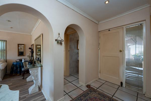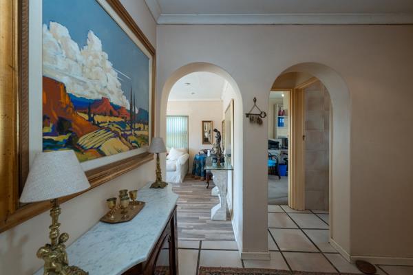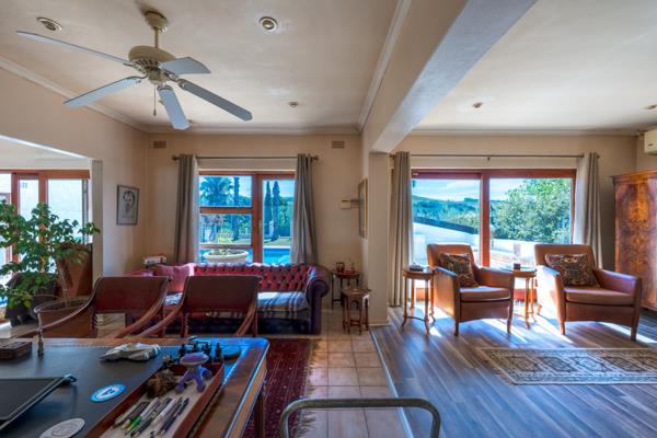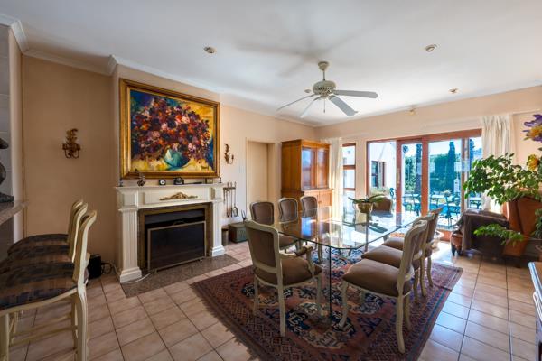 Outdoors, the property truly comes to life. Enjoy a sparkling swimming pool, an entertainment area with braai facilities, and a charming lapa set near the river that runs along the edge of the property. A tranquil courtyard hosts a feature fountain, while the grounds also include a large currently unfilled dam. The established garden is home to a variety of fruit trees, including pear, naartjie, and apple, as well as mature trees planted by Kirstenbosch.