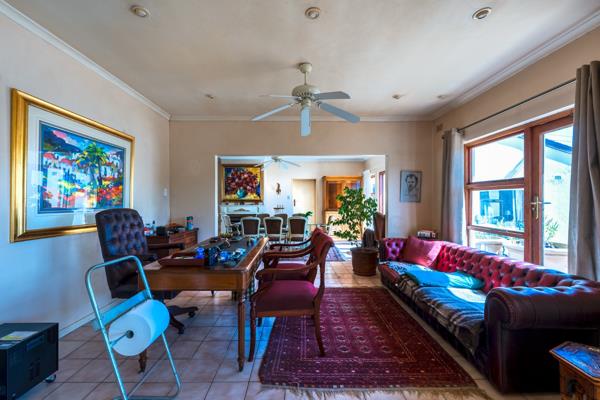 Upon entering, you are greeted by a welcoming passage, leading to a guest toilet and a private study with sliding doors opening onto the stoepperfect for working from home. The home boasts two spacious lounge areas, one with warm laminated flooring and air conditioning, and another fully tiled space with direct access to the pool and entertainment area. The dining room, complete with a fireplace and sliding doors to the outdoors, creates an inviting setting for family gatherings.