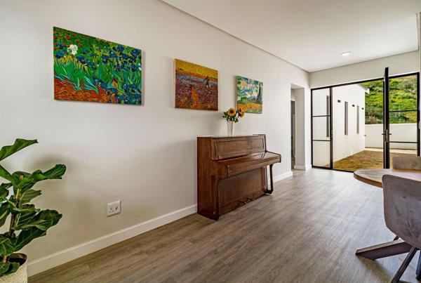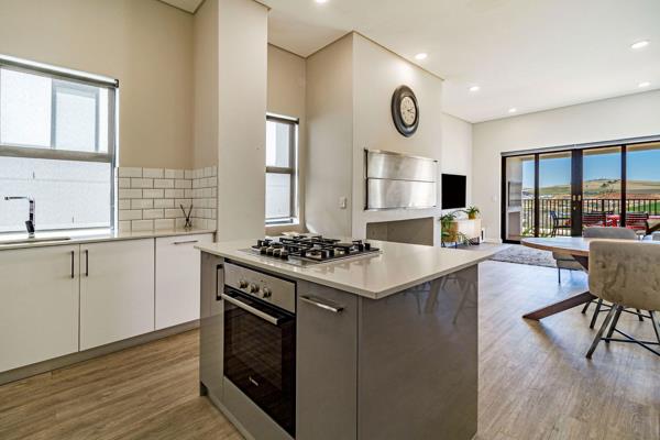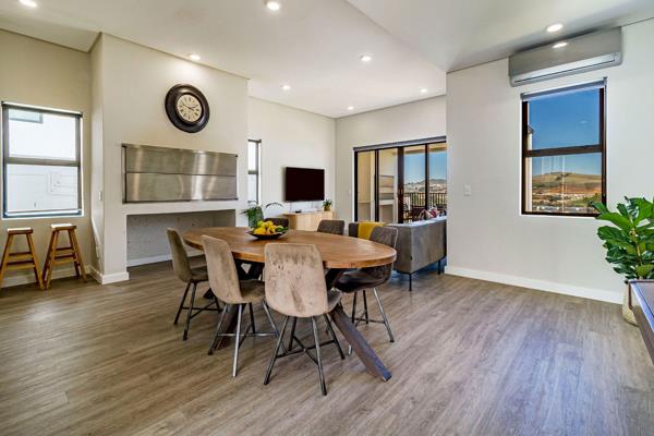 Designed on a single level, the home offers three well-sized bedrooms and two bathrooms, along with an open-plan kitchen and living area that flows onto a covered patio. The patio, complete with built-in braai, is perfect for relaxed entertaining while enjoying views of the valley and Boland mountains. With its crisp lines, aluminum windows, low-maintenance garden, and thoughtful features such as a double garage, invertor, indoor and outdoor braai you can just move in and live.