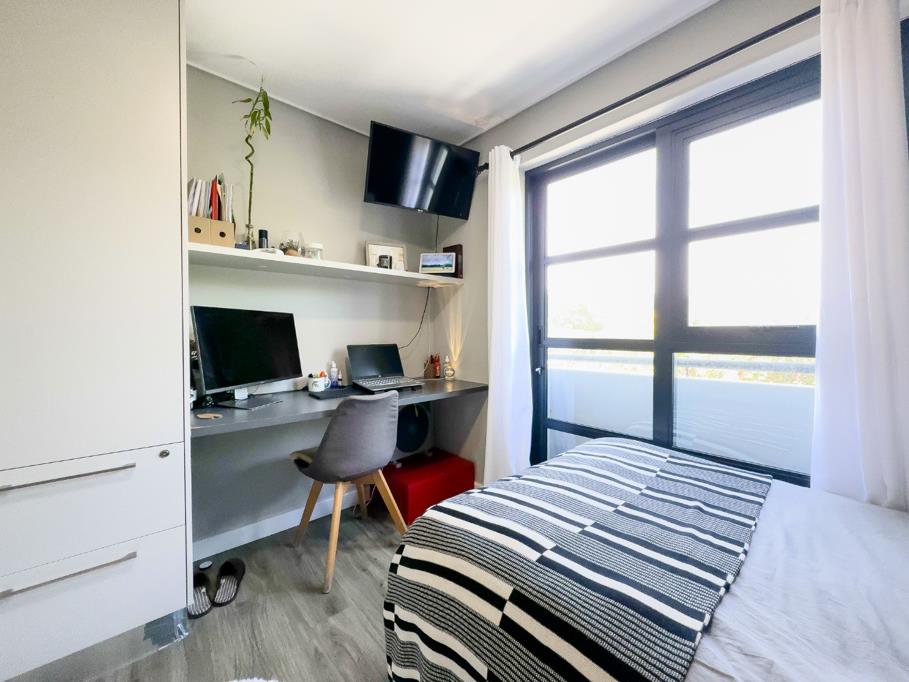 Modern 1-bedroom studio apartment with kitchenette, en-suite bathroom andamp study nook.