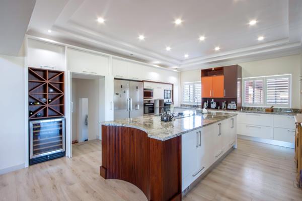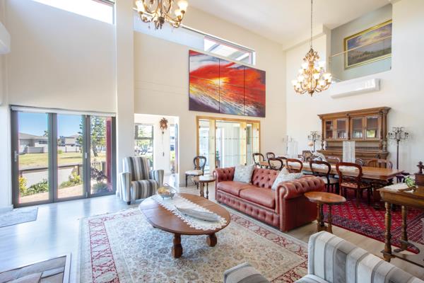 Step inside to discover a harmonious blend of classic elegance and contemporary comfort. The grand double-volume living area, adorned with folding stacker doors, seamlessly connects indoor and outdoor spaces, perfect for entertaining guests. The state-of-the-art kitchen, inspired by French design, boasts a gas stove, eye-level ovens, and a spacious scullery, catering to the discerning culinary enthusiast. The ground floor guest suite offers a private retreat, while upstairs, the opulent master bedroom takes centre stage. Its private balcony frames stunning sea and fairway views, and the Baroque-inspired bathroom provides pure luxury. Two additional bedrooms, including one with a wraparound balcony, provide unique vantage points of the estate''s natural beauty.