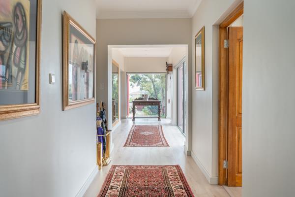 You enter the house through a foyer that leads to a large double-volume living room, with a built-in stainless-steel braai and stacker doors opening to the outdoor entertainment area.