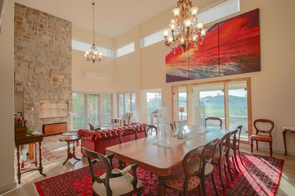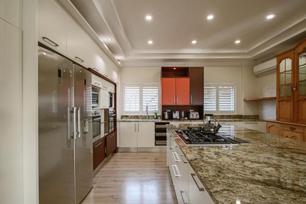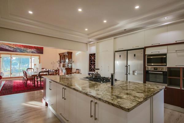 The open-plan kitchen is a chefs dream French-inspired with modern functionality. It features a gas stove, twin eye-level ovens, and a spacious scullery, ideal for both casual family meals and elegant dinner parties.