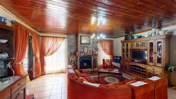 The kitchen is well-appointed with a scullery and plenty of cupboard space. The open-plan living area, featuring a cozy fireplace, can serve as a TV lounge or dining room and opens to an outdoor entertainment area. This space leads to a private pool area, which also doubles as a large Jacuzzi for relaxation. Separate toilet facilities are available nearby.