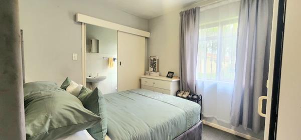 The bedroom includes built-in cupboards and an en-suite bathroom fitted with a shower, basin, and toilet.
