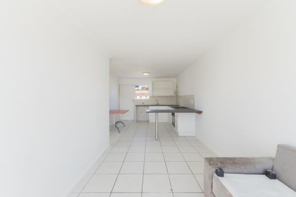 The apartment comprises one well-appointed bedroom with built-in cupboards, a neat bathroom with a bath, basin, and toilet, and a bright, open-plan lounge and kitchen. The kitchen is equipped with ample storage, an under-counter oven, and a hob, while the entire unit is fully tiled for low-maintenance, easy living. Prepaid water and electricity meters provide added convenience and control over utilities.