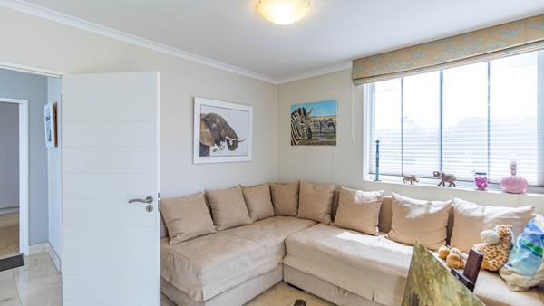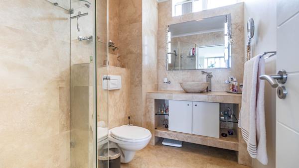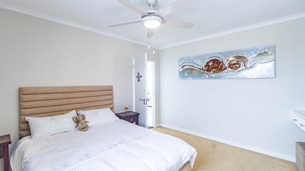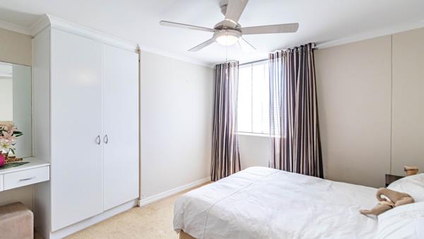 All three bedrooms are carpeted and fitted with ceiling fans for Cape Towns warmer days. The main bedroom boasts stunning sea views, its own private balcony, and an en-suite bathroom. Ample built-in cupboards are found throughout the unit.