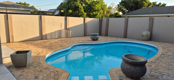 Step into luxury with this modern 3 bedroom family home, perfectly designed for comfort, entertainment, and secure living. From the moment you enter, the spacious layout and wide passage create a sense of elegance and openness that flows throughout the home. The state of the art kitchen is a chef''s dream, sleek, functional, and seamlessly connected to the lounge and dining room, which share a central fireplace that warms the entire space on cool evenings. The Braai room opens directly onto the sparkling swimming pool, offering the ultimate setting for relaxed indoor and outdoor living and entertainment. Each of the 3 bedrooms offers ample built in cupboards, while the main bedroom is a luxurious retreat with a newly renovated open plan bathroom. For added peace of mind, the double garage provides direct access to the house and there is secure parking for three additional vehicles. The property also offers beautiful views of the Helderberg Mountains, adding a touch of tranquility to this exceptional home.