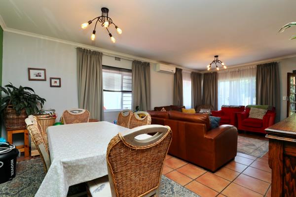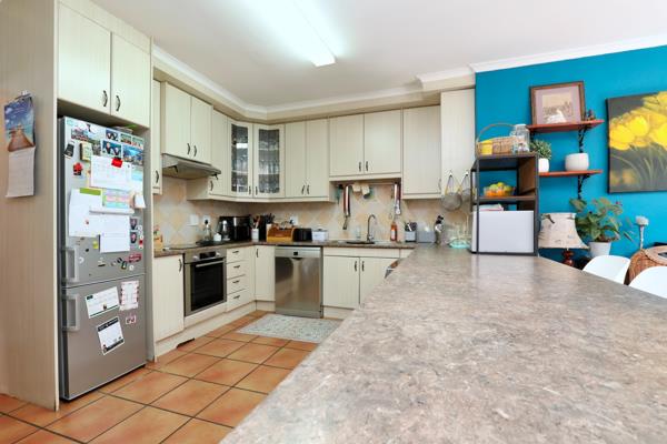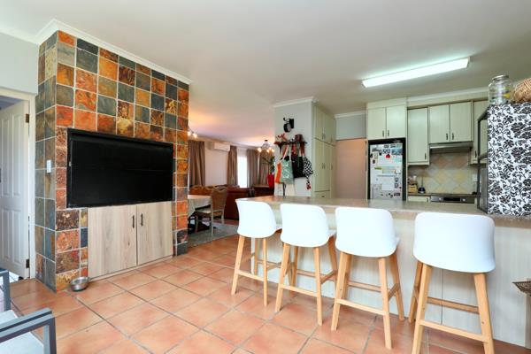 The spacious open-plan lounge and dining area flow into a well-designed kitchen with an indoor braai. The kitchen is lovely with sufficient BIC and a large kitchen counter for entertaining your guests. Aluminium stacker doors open from the kitchen to a large covered patio, overlooking the covered heated swimming pool and established garden.