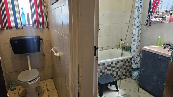 Bathroom with shower over bath and space for washing machine. Separate toilet and a linen cupboard.