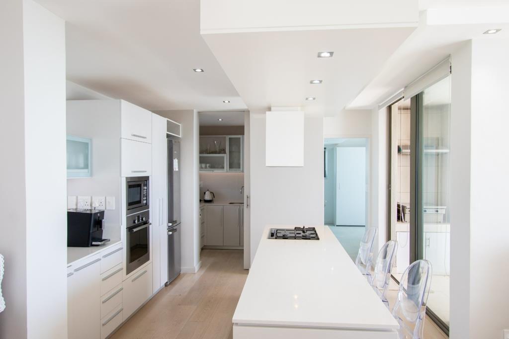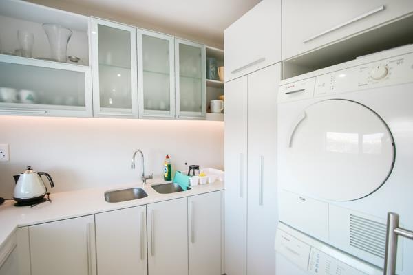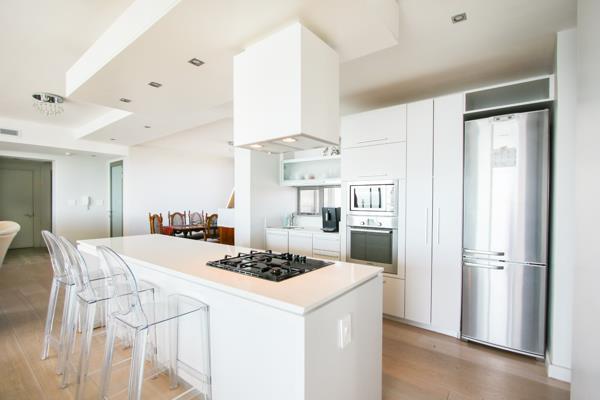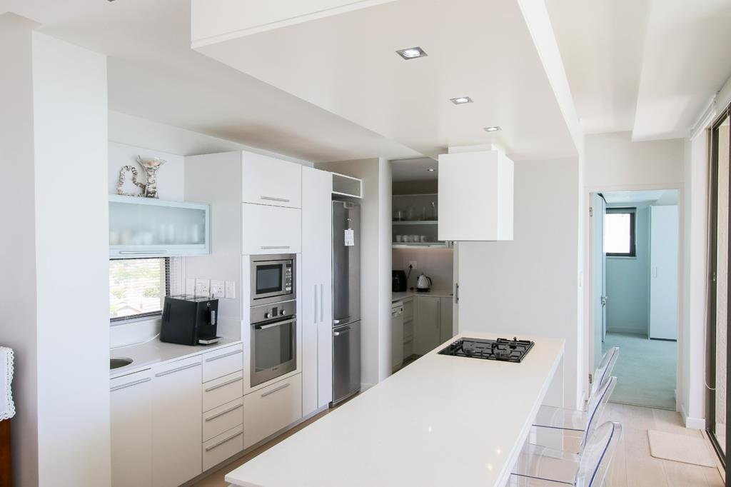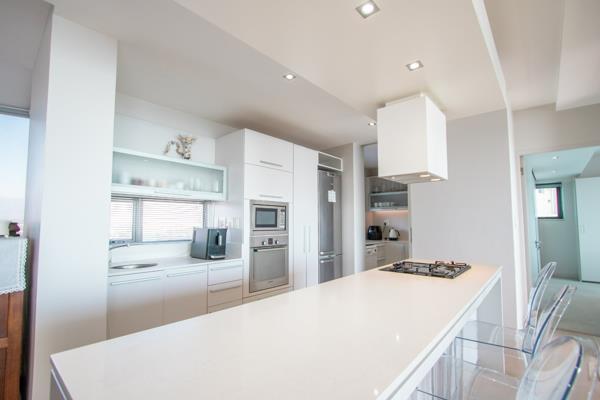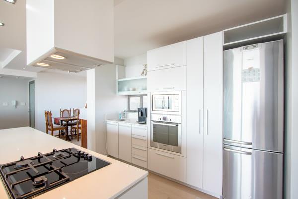 The open-plan living and dining areas extend seamlessly onto a sheltered, sea-facing balcony, ideal for all-season entertaining and fitted with a gas braai. The designer kitchen combines clean architectural lines with premium finishes, featuring a gas & electric hob, electric oven, Caesarstone countertops, built-in microwave, and a separate scullery discreetly accommodating all appliances. Real attention to detail in mind.