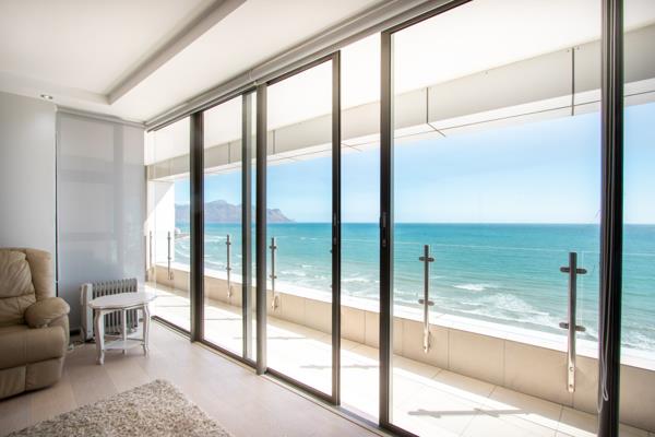 Direct elevator access opens into a private entrance, revealing expansive interiors framed by full-height glass and panoramic views across False Bay. Natural light and sea air define the living experience throughout.