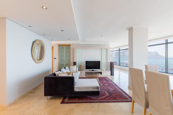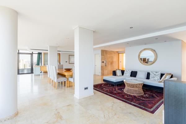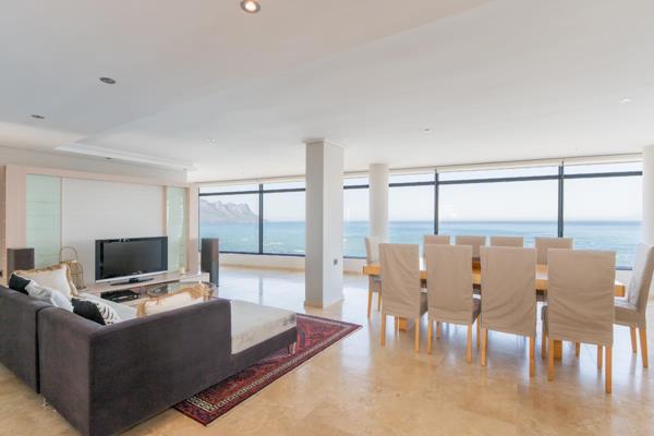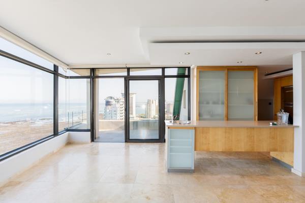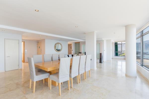 Seize your opportunity to own this 229 sqm PENTHOUSE apartment that comprises the entire floor and which exudes taste, design and sheer sophistication. From the access-controlled elevator, you are welcomed into the expansive open-plan living area that perfectly showcases 180-degree ocean views. The entire west-facing unit is clad with HIGH-QUALITY travertine flooring. The living area could easily accommodate a lounge with dining space and flows seamlessly onto a comfortable balcony ideal for enjoying timeless sunsets over the False Bay Basin. The kitchen features a breakfast nook, ample cupboard space adorned by sleek granite tops, a hob with under counter oven as well as a concealed scullery / washing room that could easily house a dishwasher AND washing machine.