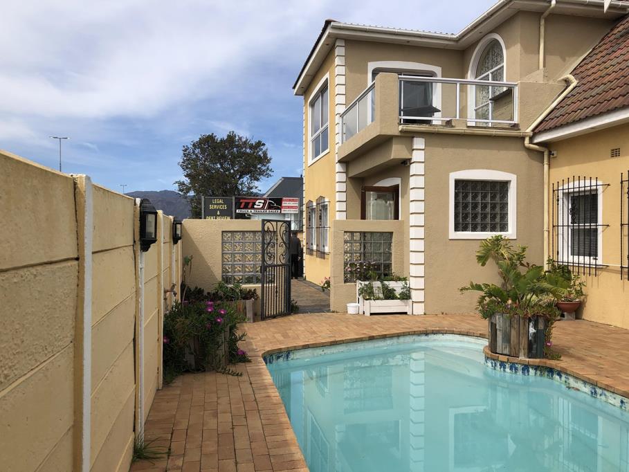 We wish to present to you this 6 Bedroom Double Storey house on Gordons Bay Road Strand South. There are 3 bedrooms on the ground floor each with its own bathroom. The main Bedroom has a walk-in closet, and the bathroom has an oval bath. The 2nd and 3rd bathrooms have showers. There are built-in cupboards in 2 of the rooms except for the smaller 3rd bedroom which has no cupboards. You also have an open plan loungedining room with a built-in braai on the ground floor and this leads out to the pool. The kitchen has a built-in stove and a hob and an extra gas stove, with ample cupboard space and granite counter tops. You then proceed up the stairs to the upper floor where you have a further 3 bedrooms each with their own bathroom with showers. All the rooms have ample cupboard space. There is parquet flooring throughout the house and slate flooring in the kitchen and bathrooms. The upper floor also has its own loungedining room. The main Bedroom upstairs has its own balcony and patio which overlooks the pool area. Two of the rooms have kitchenettes.