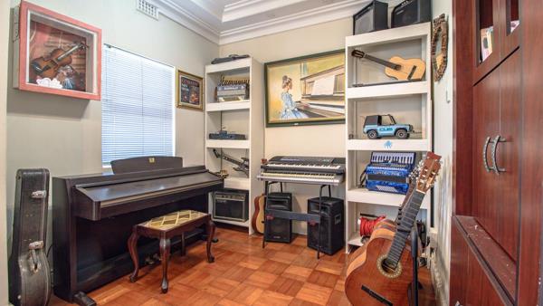 Upstairs, a second living area leads to an enclosed entertainment room with a built-in braai and access to a balcony with Helderberg mountain views. This level includes three further bedrooms and three bathrooms, one with a kitchenette and a separate external entrance, ideal for dual living or rental use.