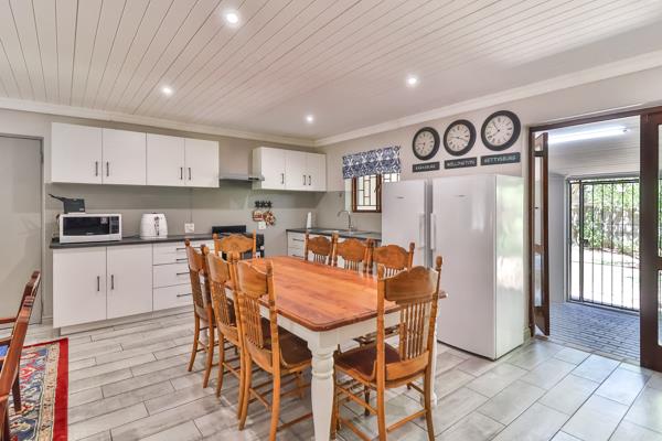 The living room flows seamlessly into a neat, well-designed kitchen fitted with ample built-in cupboards. Adjacent to the kitchen is a spacious braai room complete with a built-in braai perfect for year-round entertaining.