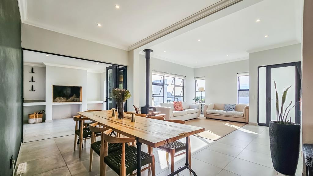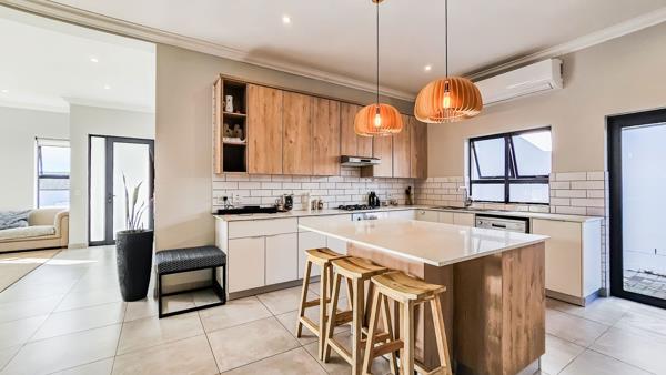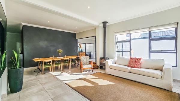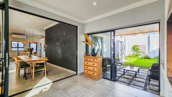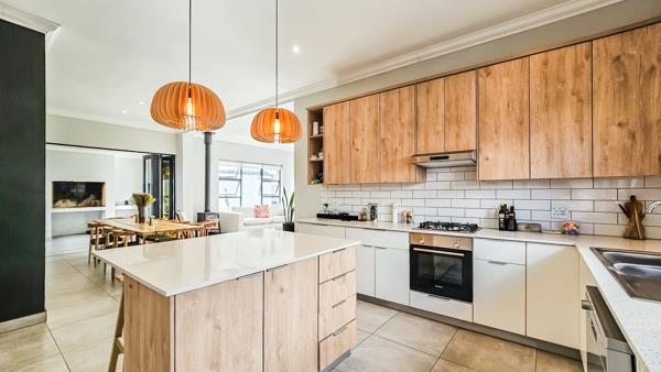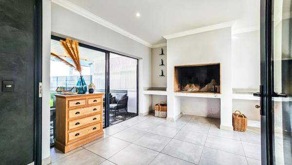 The open-plan lounge and dining area boast a combustion fireplace for cold winter days and flows into an indoor braai room stacker doors let the party spill into a private garden. In the kitchen, sleek Caesarstone counters frame a quality hob, oven and extractor. Three well-proportioned bedrooms share two contemporary bathrooms, and the house stays comfortable year-round thanks to ceiling fans, three air-conditioners, blinds, and an inverter system.