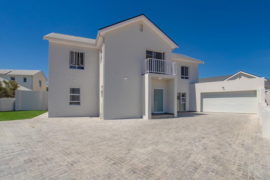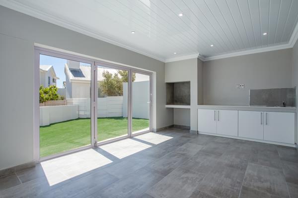 Upon entering through the front door, youre greeted by a massive open-plan living area that seamlessly integrates with the modern kitchen. The kitchen offers ample cupboard space, a loose-standing gas stove with extractor fan, and an ideal layout for cooking and entertaining. The living area extends to a covered braai area with stacker doors that open onto a paved patio with artificial grass the perfect setting for relaxed indoor-outdoor living. There is also approved plans to add a swimming pool.