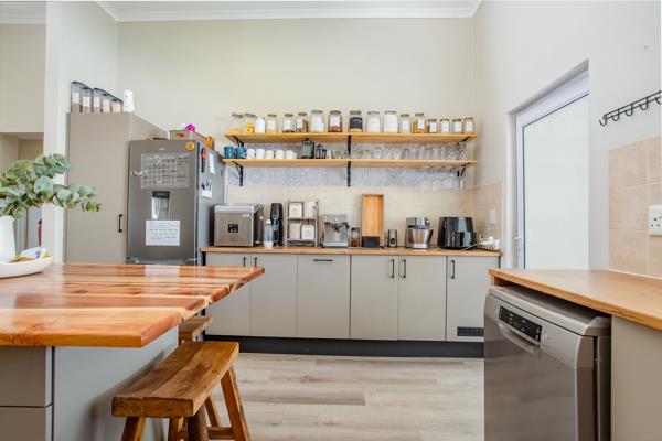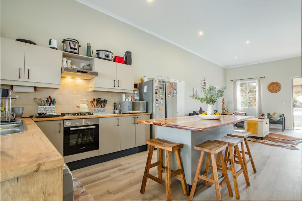 The spacious living area and kitchen flow seamlessly into the entertainment space, featuring a well-equipped built-in braai and sliding doors that open onto the garden ideal for both relaxation and entertaining. The stylish kitchen boasts modern cabinetry, unique wooden countertops, and a breakfast bar.