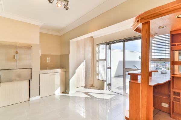 The living area also includes a built-in bar, while the stainless steel braai adds a modern, polished touch to the entertainment space.