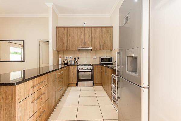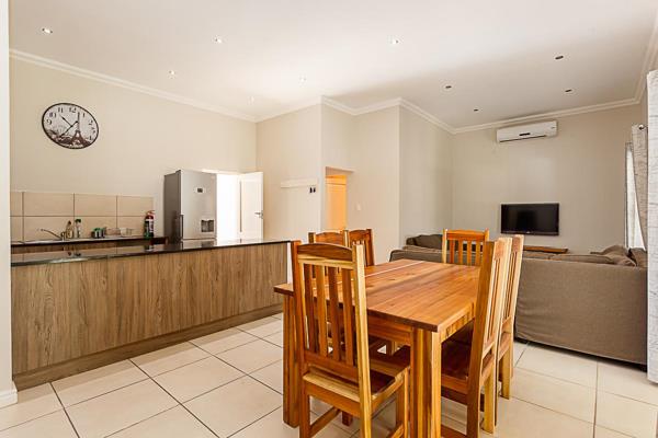 The open plan kitchen has granite tops, a gas Hob, and an electric oven. The Tv Family area and dining area open with a sliding door to the covered braai area overlooking the lush green garden with a jungle gym and a big tree.