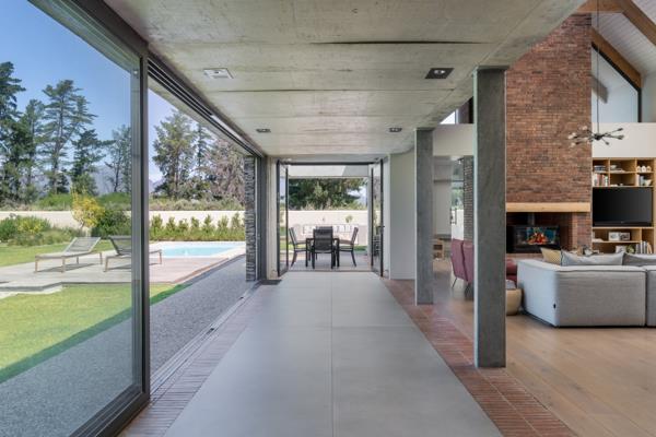 Large aluminium sliding doors when opened, creates a seamless flow between indoor and outdoor areas. The covered entertainment patio overlooks the swimming pool, landscaped garden, and firepit area, all positioned to take full advantage of the estate''s magnificent mountain views.