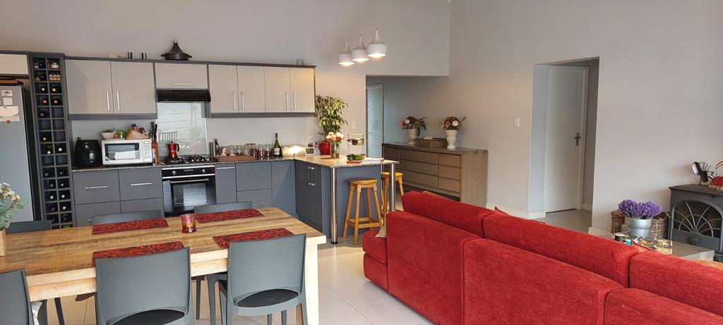 Set on a 480 m² plot within a 24/7 manned security estate, this five-year-old property (first owner) has been cared for with pride. The open-plan kitchen with a scullery flows into a spacious living and dining area with an indoor braai, perfect for relaxed entertaining. Step outside to a cosy garden with a large wooden deck, artificial grass at the back and natural lawn in front: low-maintenance and lovely year-round. The garden is completely fenced, with 2 small gates at each side of the house, so furry friends can roam free.
