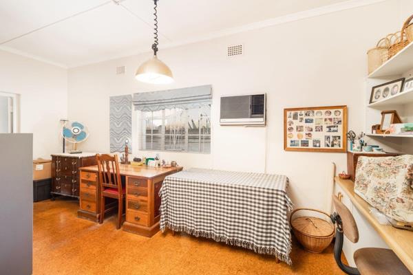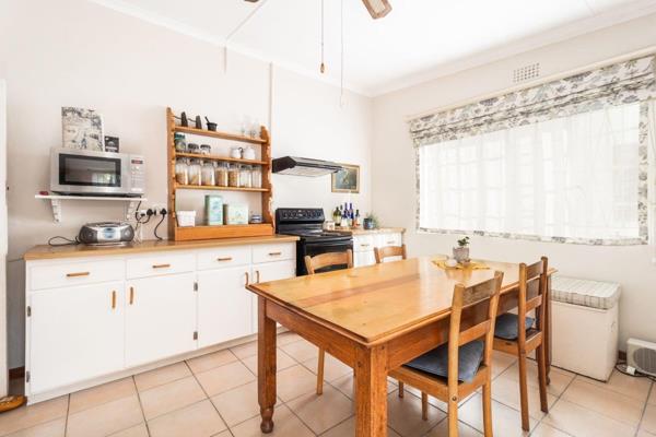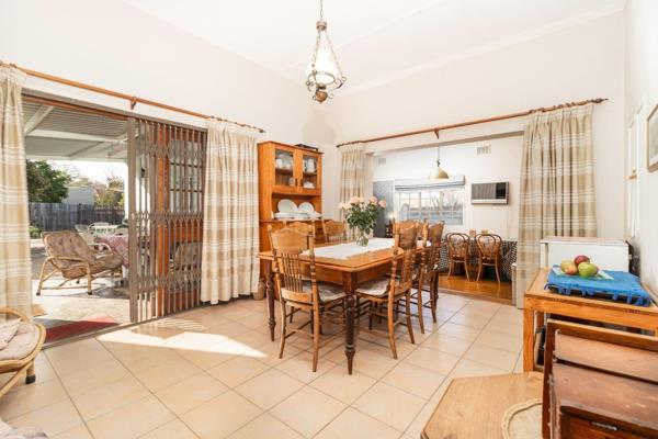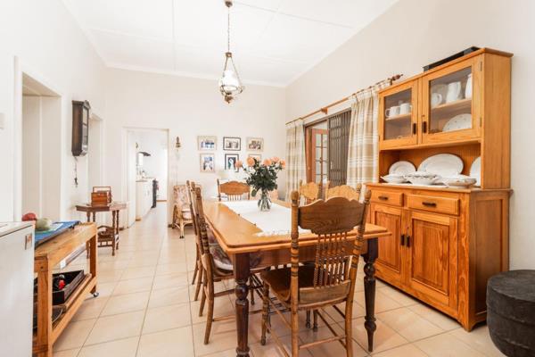 The well-appointed kitchen boasts ample cupboard space and a separate scullery with water points for appliances. The spacious lounge offers warmth with its rich wooden floors and a cozy fireplace, perfect for relaxing evenings. Adjacent to the lounge, the generously sized dining room includes an additional area ideal for a home office. French doors lead from the dining room to a covered patio with a built-in braai, creating the perfect setting for outdoor dining and entertaining.