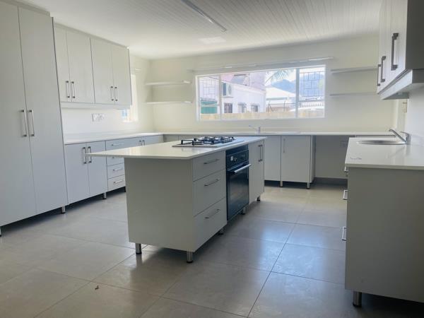 Step into a brand new, spacious modern kitchen equipped with built-in cupboards and a gas stove.