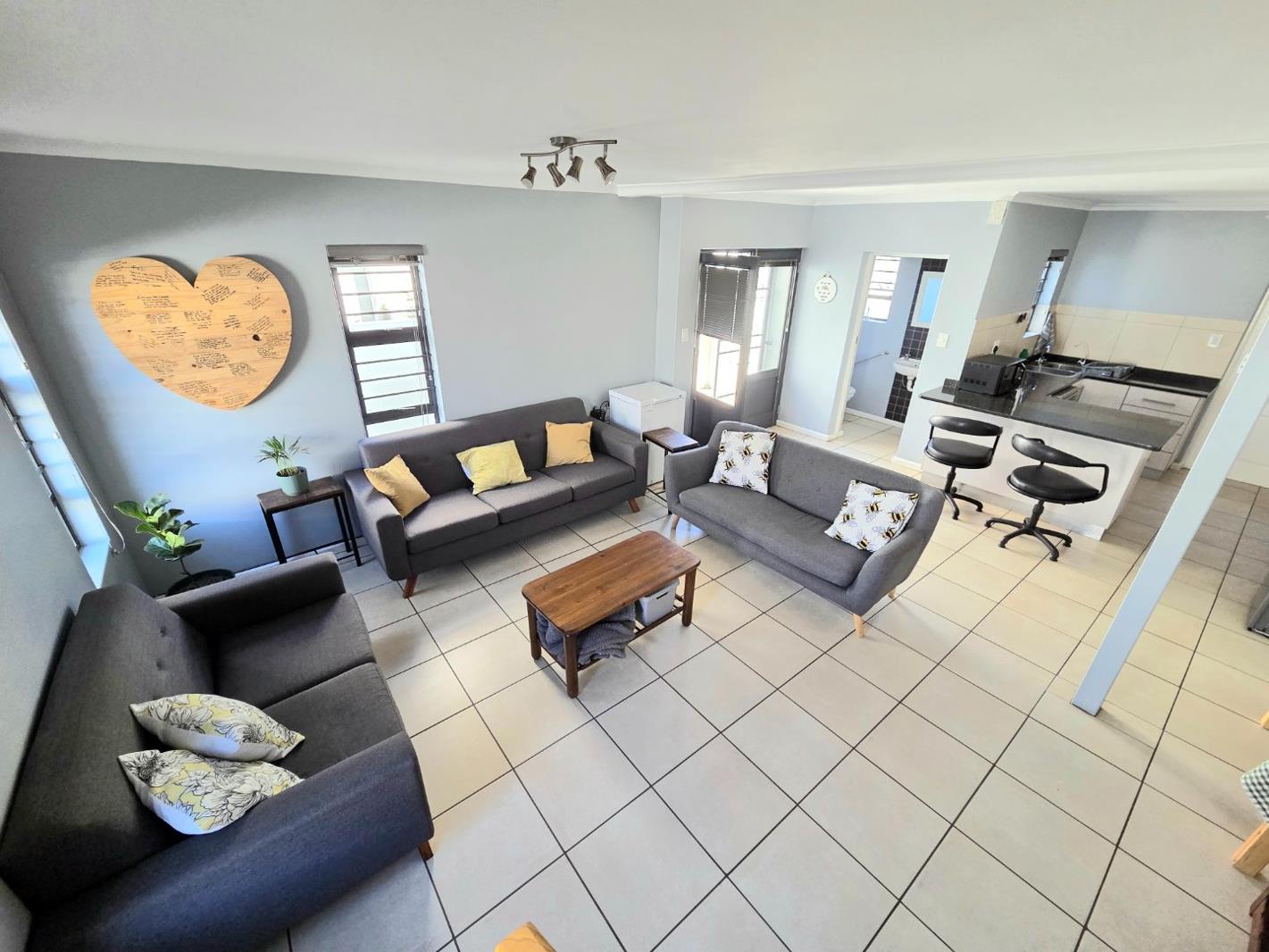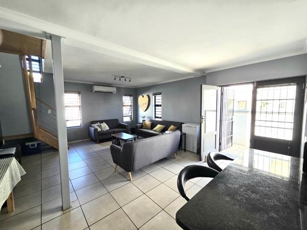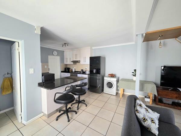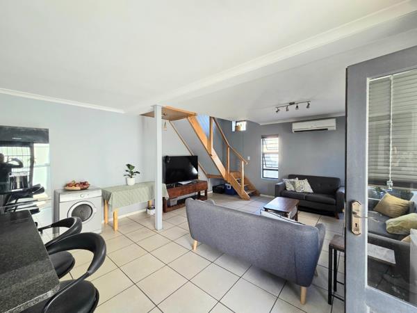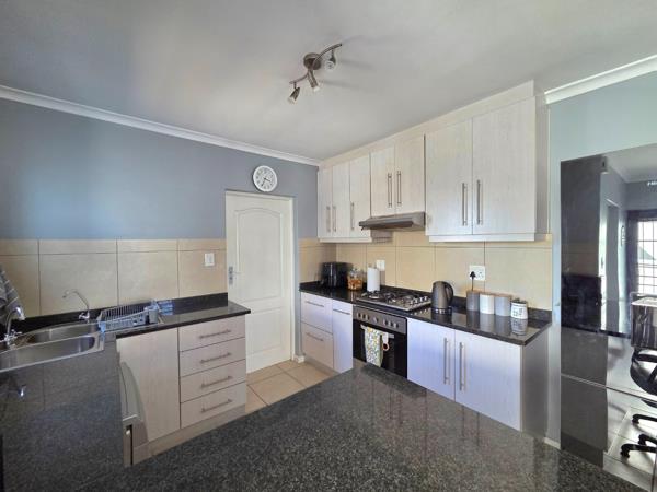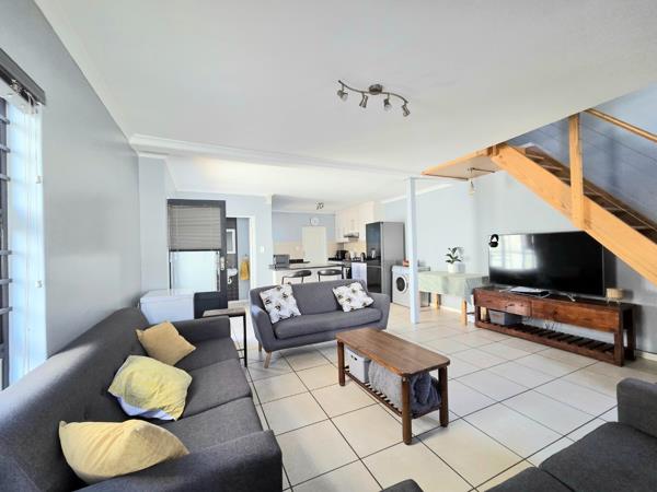 Upstairs are 2 bedroomswith BIC''s and full bathroom. The Main bedroom is spacious with a large balcony offering lovely mountain views. The modern, open-plan kitchen and living area creates a warm & welcoming space, as well as guest toiletdownstairs. Step outside to a built-in outdoor braai area, perfect for entertainment. The yard is enclosed and ideal for small dogs. A single garageelectric door, washing machine point & direct access offers extra storage space and secure off-street parking for 2 vehicles.