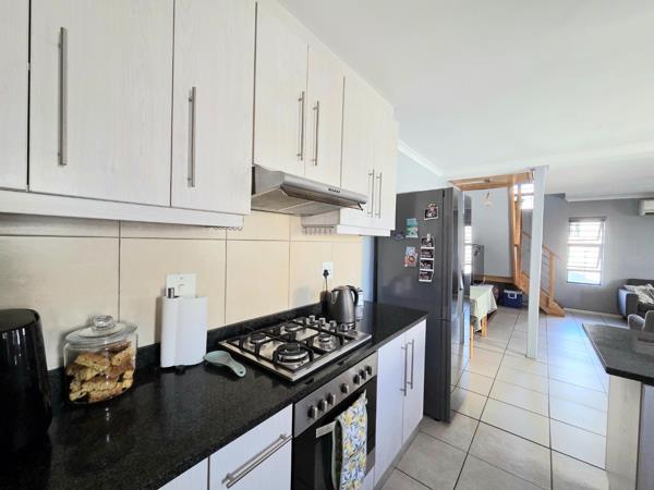 Upstairs are 2 bedrooms(with BIC''s) and full bathroom. The Main bedroom is spacious with a large balcony offering lovely mountain views. The modern, open-plan kitchen and living area creates a warm & welcoming space, as well as guest toilet(downstairs). Step outside to a built-in outdoor braai area, perfect for entertainment. The yard is enclosed and ideal for small dogs. A single garage(electric door, washing machine point & direct access) offers extra storage space and secure off-street parking for 2 vehicles.