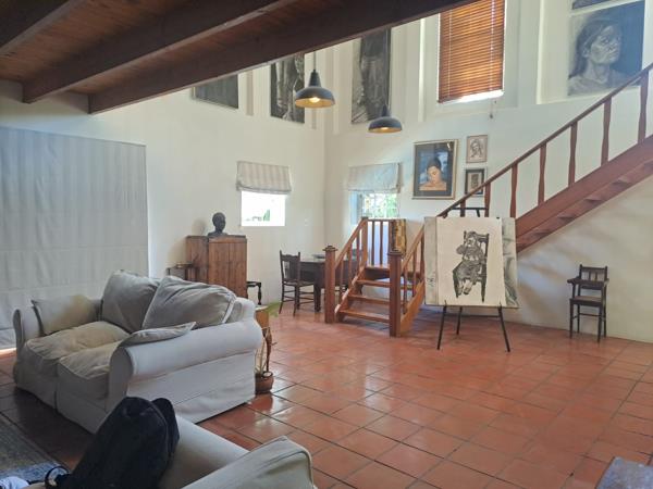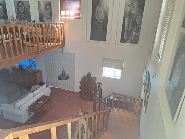 Inside, the home welcomes you with an inviting living room, featuring a staircase that leads to an additional living area and two well-sized bedrooms, each with its own en-suite bathroom, offering privacy and comfort. The braai room flows seamlessly through a door to the covered braai area and sparkling swimming pool, making it ideal for entertaining.