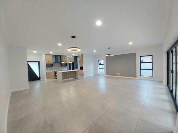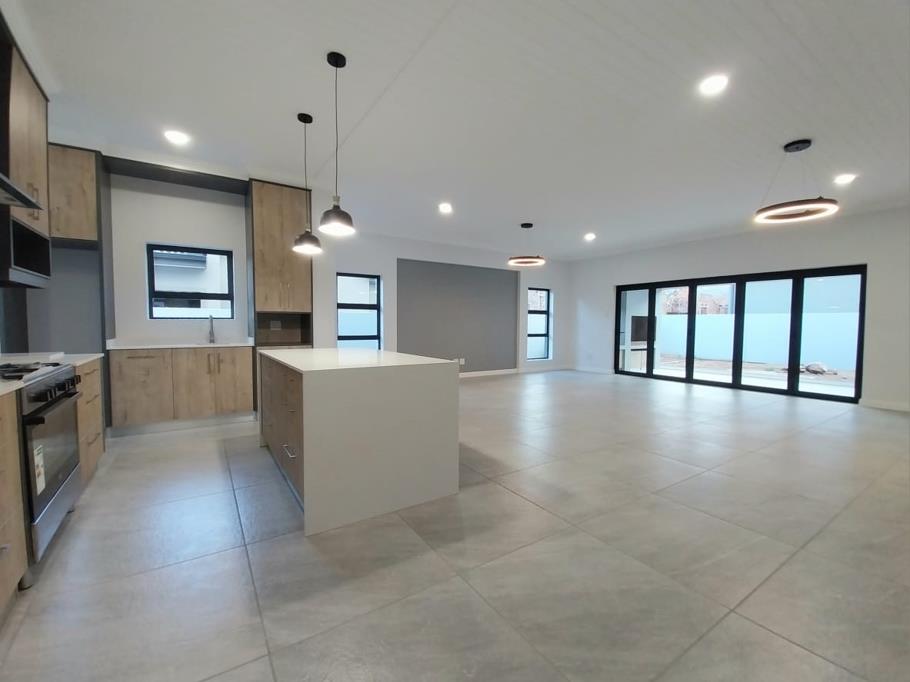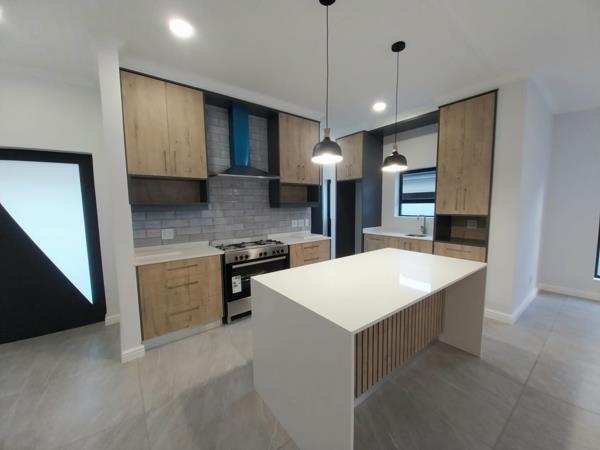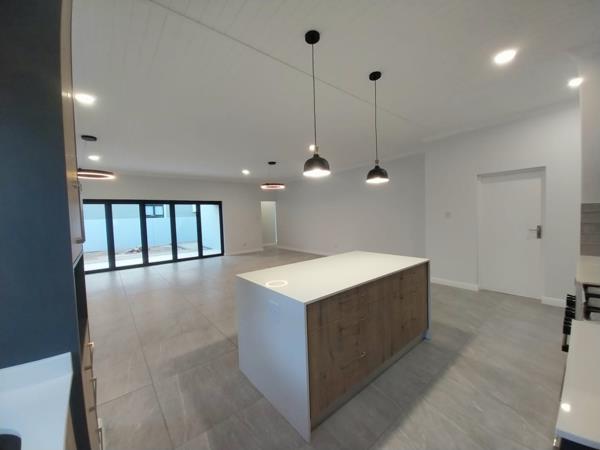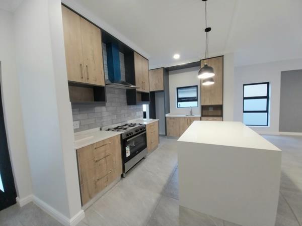 The focal area of the home is the open-plan kitchen with a stylish centre island and ample built-in cupboards, providing plenty of storage and workspace. The seamless flow from the kitchen leads to a comfortable lounge area, perfect for relaxing and entertaining guests.