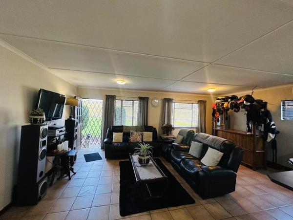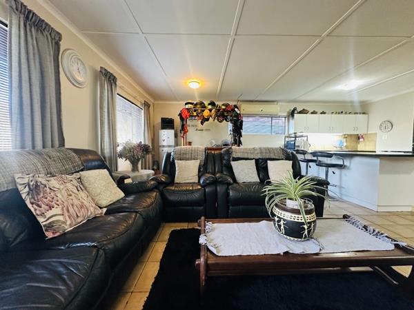 It offers a large open-plan lounge, dining room and kitchen, three bedrooms with built-in cupboards, two bathrooms main en-suite and a second full bathroom, and ample storage, including a Wendy house.