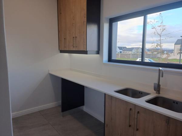 This elegant home features three bedrooms, all with built-in cupboards. The main bedroom is a true sanctuary, boasting state-of-the-art finishes and a beautifully finished en-suite bathroom complete with a walk-in-shower, double basin, bath and toilet. A second bathroom includes a walk-in-shower, basin and toilet for added convenience.