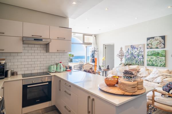 The open plan living and dining area flows onto a private balcony, ideal for entertaining or relaxing with breathtaking sea views. Both bedrooms are generously sized with built in cupboards. The kitchen is modern, functional, and well-equipped.
