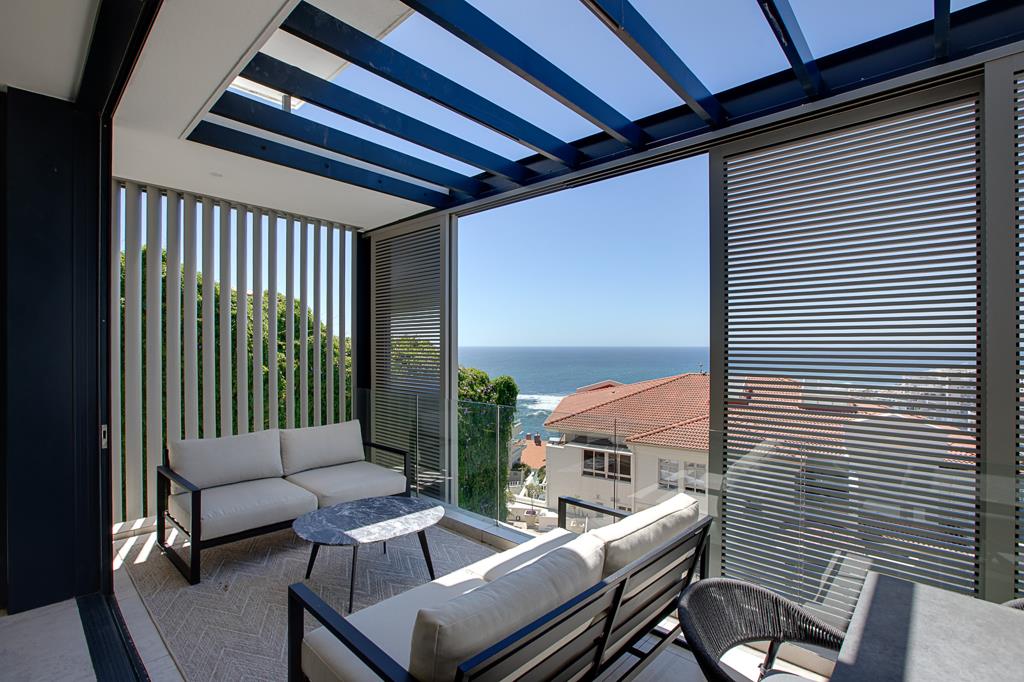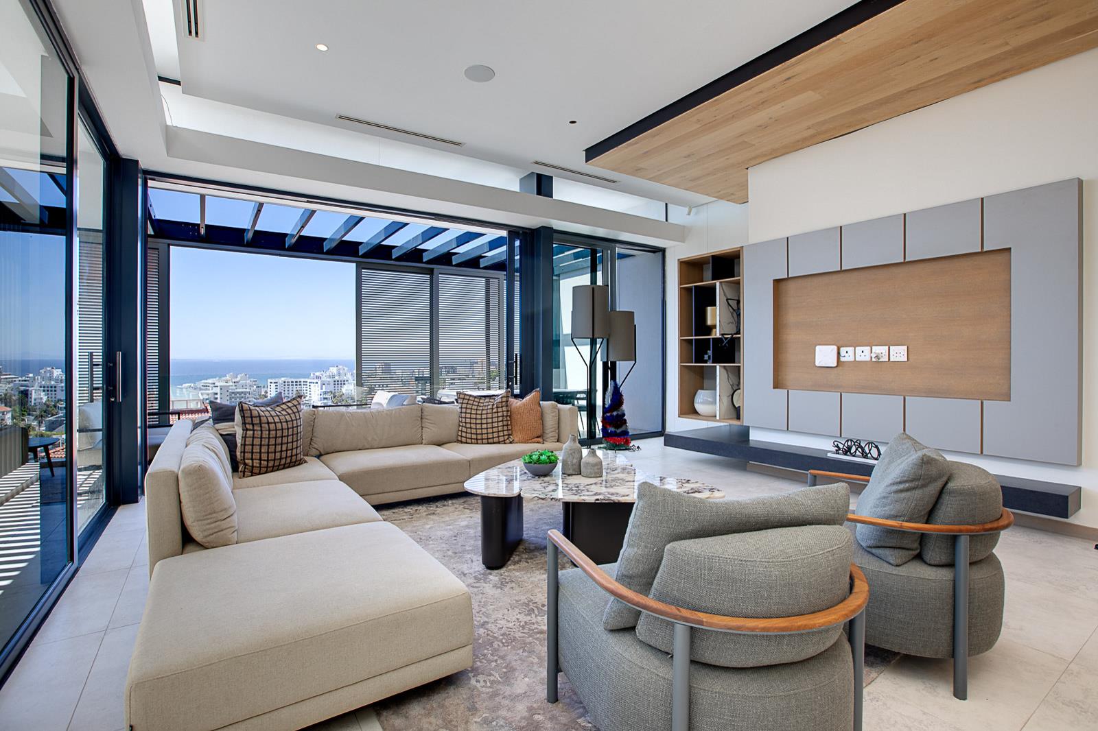 Third Floor: A private lift opens to an open-plan living area wrapped in floor-to-ceiling glass. The designer kitchen with scullery connects to dining and lounge spaces that flow onto a balcony overlooking the sea.