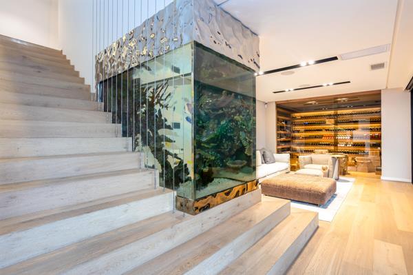 The ground floor is an entertainers paradise, boasting a relaxed lounge, a convenient kitchenette, a climate-controlled wine cellar, and an impressive fish tank feature. From here, doors open to a spacious patio, inviting pool, lush garden, and a second outdoor lounge area.