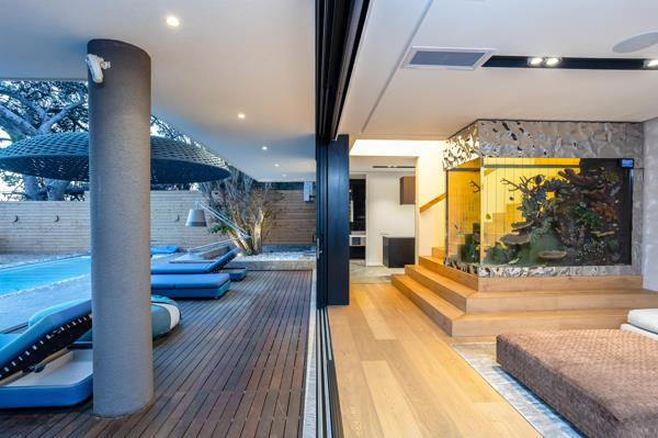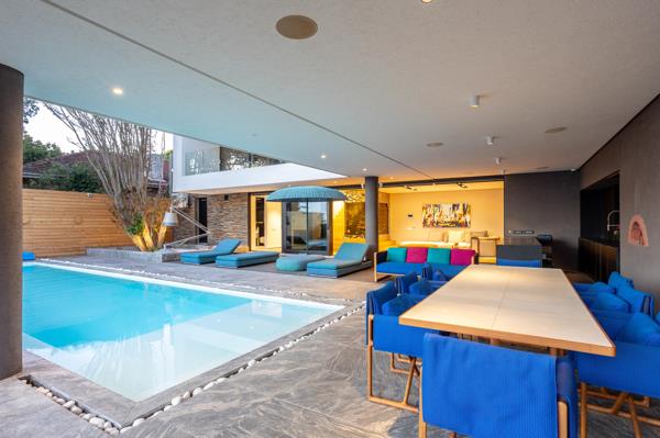 Step inside to an expansive open-plan kitchen, lounge, and dining area. This bright living space extends onto a wraparound entertainment terrace, complete with a stylish bar and generous outdoor seating, perfect for hosting or relaxing under the Cape Town skies.