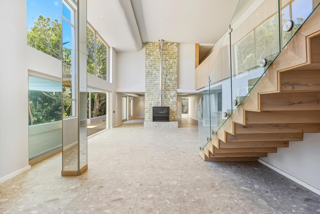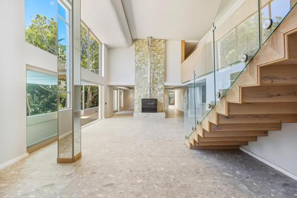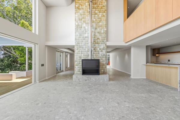 Spacious open-plan living areas flow from the modern kitchen, complete with a scullery, laundry room, and store room. Double-volume ceilings enhance the sense of space, while a wood-burning fireplace creates warmth and character.