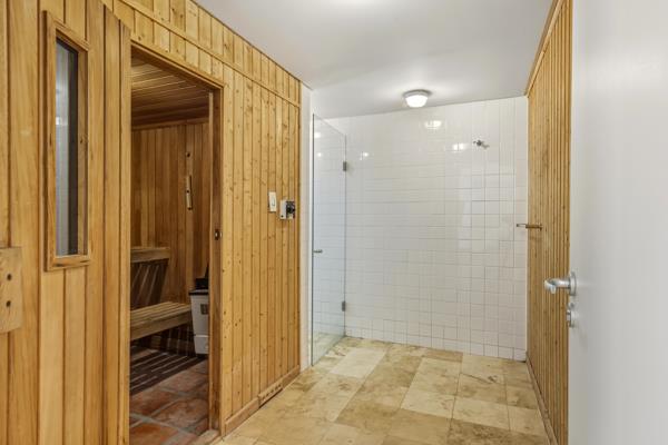 Additional features include a sauna, guest cloakroom, outside bathroom, double garage, premium finishes throughout, and air-conditioning in every room.